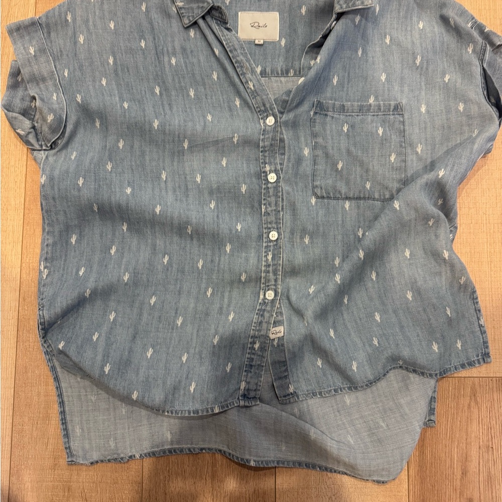 Chic light blue button-down shirt. Features short sleeves and a front pocket. Ideal for everyday wear.