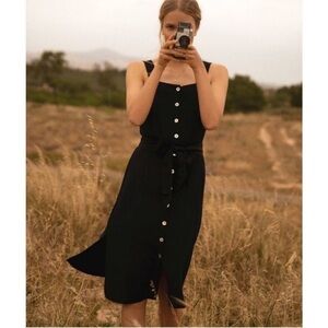 Sleeveless, button-down front, midi-length chambray column tank dress featuring side slits, shell buttons, and a removable belt.