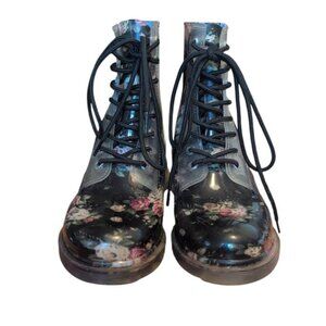Rain Boots Lace up Black Floral Rain Transparent Waterproof Ankle Combat Boots
