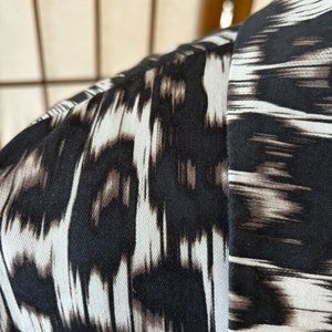 An unusual rain jacket in an animal like print of dark brown, tan and cream colours. It’s a knee length, with a double breasted buttoned front and belt. Its made of a cotton spandex blend. Check out the inside finished with red piping; beautifully finished! The sleeve has a buttoned strap to finish it off. Size XL , measurements: underarm to underarm 23 inches, sleeve length 23 inches, back width 16.5, back length 38 inches