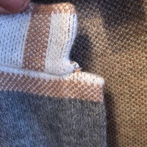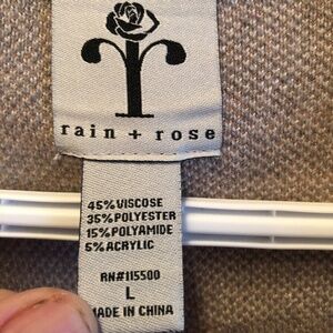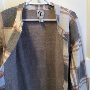 Lovely cardigan over jacket, multi- coloured - size large- new or worn a few times, Rain and rose dressy cardio at, grey, tan and beige with pockets. Very comfortable. Can be dressed up or down, wear a blouse and a skirt, pants and shirt, dress,
