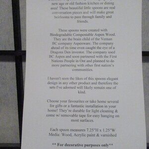 Each spoon measures 7.25″H x 1.25″W, Aspen Wood, Acrylic paint w/ acrylic high gloss glaze.