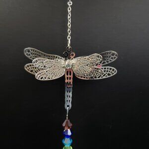 Bring positive energy and dazzling light into your space with this exquisite crystal suncatcher. It features a beautifully detailed, filigree-style silver-tone metal dragonfly, symbolizing transformation and joy.