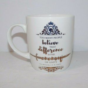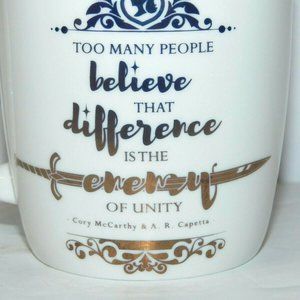 This Rainbow Crate LBGT Once & Future McCarthy & Capetta Novel Spaceship Castle & Quote Fine Bone China Mug is in Excellent clean Unused condition. Measures 3.75" Tall and 3.25" in diameter at the opening. Item is dishwasher and Microwave safe. Features Once side with Image of Spaceship and Castle and Otherside with Quote from the Novel " Too many People Believe that difference is the enemy of unity" Mug is white with images and quote in gold.