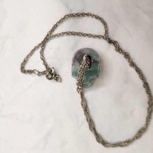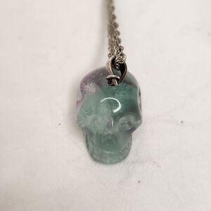 Blue Green & Purple Carved Rainbow Flourite Crystal Stone Skull Pendant with Silver Bail on White Gold Plated Sterling Silver Rope Chain.