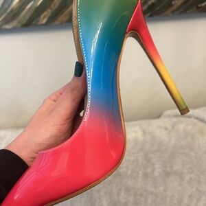 These heels are from Only Maker in patent leather and rainbow colour. Size 10. They fit like a glove but are very tall.