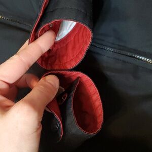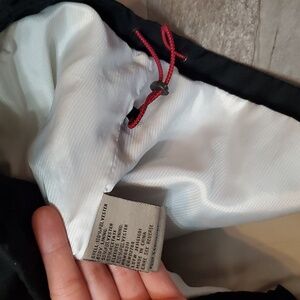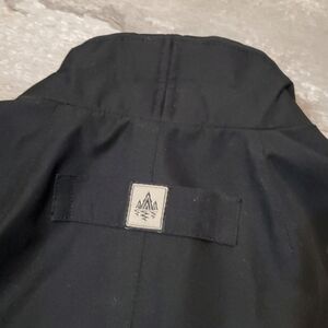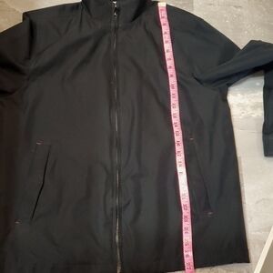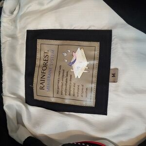 Rainforest Men's Black Jacket. Men Size M, see pictures for measurements. White lining inside. Red inside the wrists. Waterproof, windproof & breathable fabric. Small collar. Front pockets. Adjustable cord at the bottom of the jacket. Flaws on sleeves as seen on pictures. No stain, no rip. Non smoking house.