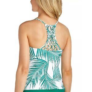 A boho-chic strappy macrame back decorates this statement swim style from Raisins, bringing fun and sophistication to this tropically printed tankini top.