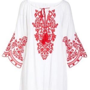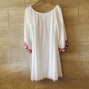 Elegant white dress with intricate red embroidery. Features 3/4 sleeves and a relaxed fit. Perfect for casual or special occasions. Fully lined. Would also be a gorgeous swim ๐ cover up.