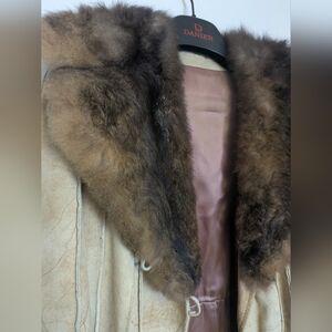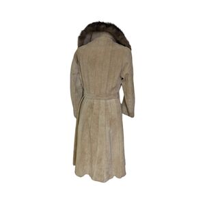 Patchwork style buttery soft suede leather trench length jacket. Satin lining. Luxurious fur notched statement collar. Inner button is missing so could easily be replaced as it isn't seen in the inside.