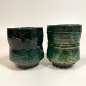 Set of 2 Raku pottery cups. Each has hand etched designs within the clay, one of a human-type figure and the other of a house. Each cup is finished with a green irridescent glaze. These cups are slightly different sizes but glaze is the same.