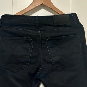 This pair starts out black, but will reveal indigo undertones over time. The effect can be seen in a couple of photos where the fades are just beginning to come in. 2 washes, about 15 wears.