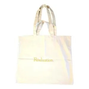 This is a beige Réalisation Par Mini Tote with orange lettering and double shoulder straps.