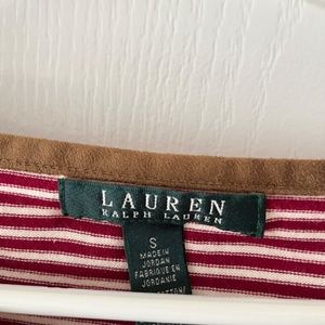 Women’s Lauren by Ralph Lauren 3/4 long sleeve top. Like new. Red and white trips with velour trip around neck line and pocket.