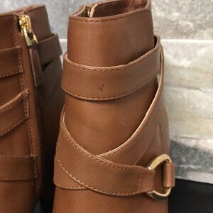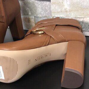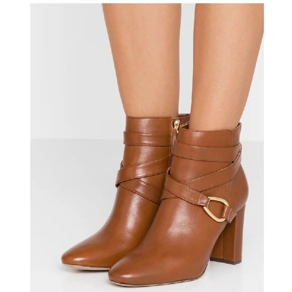 A buckled leather ankle strap and equestrian-inspired hardware add contemporary touches to the polished LAUREN Ralph Lauren® Addington bootie.