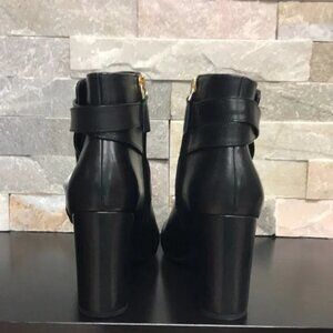 A buckled leather ankle strap and equestrian-inspired hardware add contemporary touches to the polished LAUREN Ralph Lauren® Addington bootie.