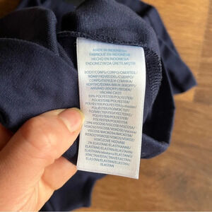Navy blue dress with striped white/blue bow.