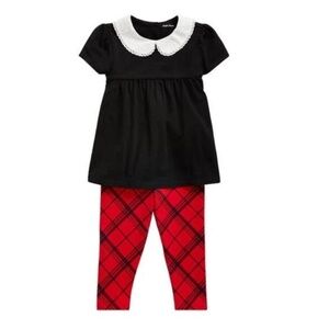 This sweet, festive two-piece set comes with a jersey top featuring an embroidered Peter Pan collar and tartan plaid stretch leggings.