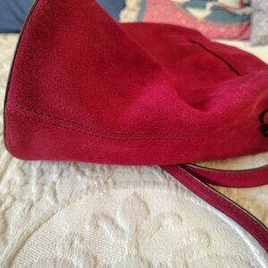 Lauren Ralph Lauren bucket bag in burgundy suede measures approx. 10"x10"x6" and is in very good used condition. The bag has a shoulder strap, a removeable crossbody strap, and a decorative suede tassel. Interior has 1 zip pocket, 2 slip pockets and a slip pocket with snap closure. The bag closes with a snap closure.