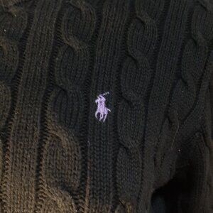 Classic black cable knit sweater. Features crew neck design. Iconic Ralph Lauren logo in purple.