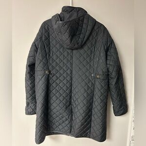 Classic in a diamond-quilted finish, this field coat features a removable hood and faux leather trims for a town and country look.