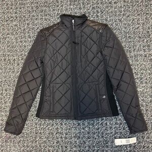 Stylish black quilted jacket. Features a zip-up front and buttoned pockets. Perfect for cool weather.