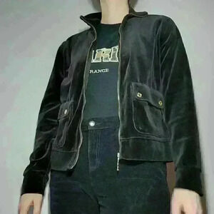Elegant black velvet sweatshirt. Features gold zipper and button details. Perfect for stylish layering.