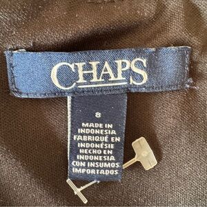 This Chaps dress features a sophisticated black and white design, perfect for cocktail events or as a wedding guest. The sheath style with cap sleeves and a crew neck offers a timeless and elegant silhouette.