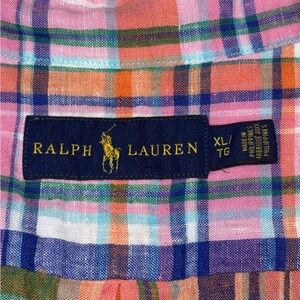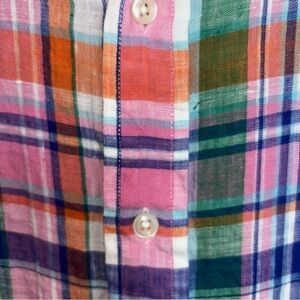 This Ralph Lauren casual button down shirt features a vibrant plaid pattern in pink, blue, and green, perfect for adding a pop of color to your summer wardrobe. Made from lightweight fabric, it offers a relaxed fit ideal for warm weather and informal occasions.