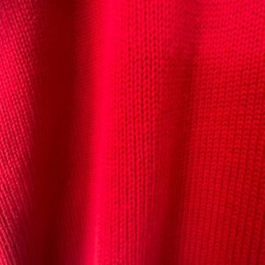 Red with black and white pattern. 27" under arm to arm and 30" long from shoulder to hem.