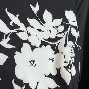 Stunning black and white floral graphic dress with boatneck neckline and 3/4 sleeve - Size 10. The floral graphic print flows on both sides of the dress. This style is very figure flattering with below the knee hemline. Pristine condition, never worn. Smoke and pet free home.
