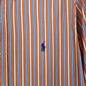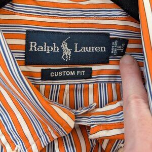 This shirt by Ralph Lauren is made of 100% cotton and features a vertical stripe pattern in orange, blue, and white. The shirt has long sleeves with buttoned cuffs, a button-down collar, a buttoned front, and a rounded bottom. It is marked as a "Custom Fit", if you're familiar with Ralph Lauren cuts. The shirt has normal wear, but no issues affecting wearability.