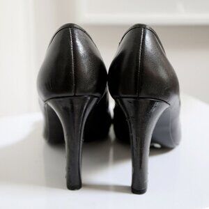 Minimal and classic, dark chocolate brown (almost black) leather pumps with crossed straps a gold tone belt buckle at the toe. Great for the office or a night out! Leather upper, manmade sole - unmarked.