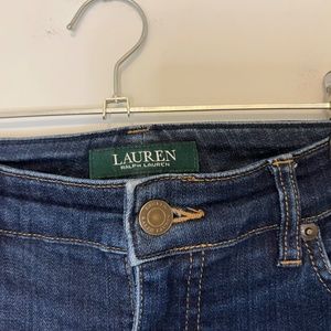 This pre-owned pair of LAUREN by Ralph Lauren denim jeans is perfect for any casual occasion. Made with dark wash denim fabric, these straight leg jeans feature a mid-rise fit and a 29 inch inseam. The size 6 regular fit is true to size and the stretchy material allows for easy movement.