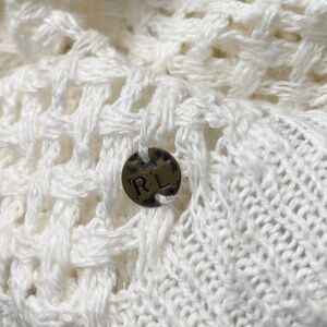 Linen-cotton blend, multi-textured, cream coloured pullover by Denim + Supply. Sleeves are 3/4 and bust is 46". Length is 24" and there are multiple knit patterns, creating an airy, lacey effect.