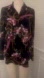 Elegant blouse with floral and chain print. Features purple and gold accents on a dark background. Good used condition. Polyester.