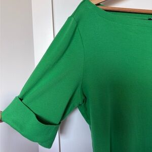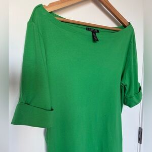 Chic and timeless, this vibrant green Lauren Ralph Lauren top features a flattering boatneck and cuffed sleeves for an effortlessly polished look. Soft and comfortable, perfect for pairing with jeans or dressing up with accessories.
