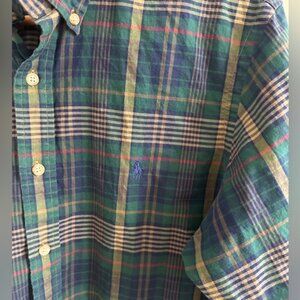 Timeless and versatile, this Ralph Lauren plaid button-down shirt is a polished essential for any wardrobe. Designed in a slim fit for a modern, tailored silhouette, it combines classic styling with everyday wearability. The green plaid pattern adds a preppy yet casual touch, making it perfect for business casual looks, weekend outfits, or layering under sweaters and jackets.
