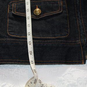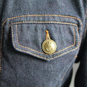 Excellent, basically new condition, it has only been worn and washed once, it's a bit small for me. Great dark denim colour, nautical style with brass zipper pull and buttons. Casual but little bit dressier/sleeker style then typical jean jackets. Measurements shown in pics.