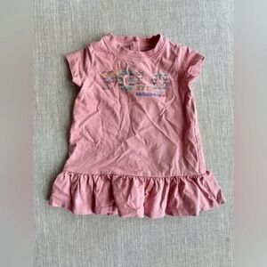 Pink POLO logo dress set for baby girls by Ralph Lauren. Made from soft cotton jersey. It features the colourful brand logo 'POLO' print on the front with frill skirt and a button fastenings at the back. It comes with matching knickers which are gently elasticated.