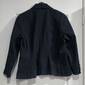 Elegant navy blazer with double-breasted design. Features classic notched lapels and buttoned cuffs. Perfect for formal occasions.