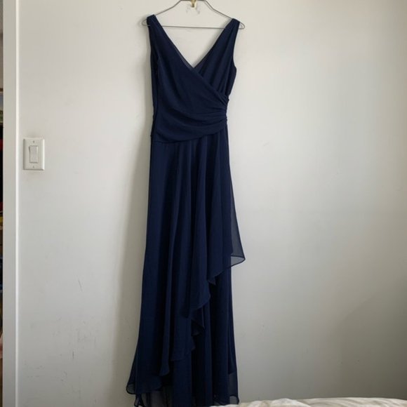 The back is lower (kind of high low) and drapes so beautifully around the legs. Depending on your height, the dress can even trail behind you for added elegance!