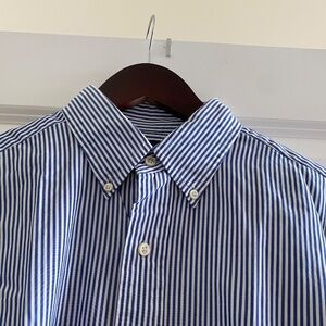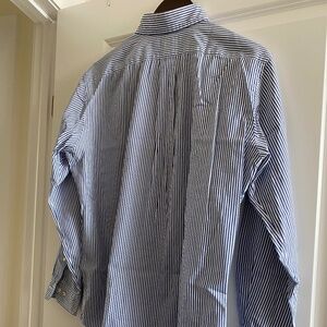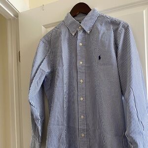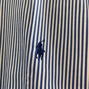 Ralph Lauren navy blue & white pinstripe long sleeve button down shirt, Classic Fit, size 15 1/2\32\33. Gently used in excellent condition, no rips or tears. Ralph Lauren logo on chest, pleaded back, machine washable. Measures approximately: body length of 32" & 24"W with a sleeve length of 32/33". All measurements are approximate & smoke & pet free home.