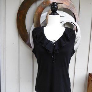 Like new, Sleeveless Ralph Lauren - Chaps, V-neck T Shirt. Neck has ruffle with lace up detail. Size Medium, Petite. Colour - black. 100% Cotton
