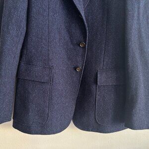 The jacket has a notch lapel, features patch pocketswith flaps and is single vented. The fabric is a wool cotton blend dark navy flecked with a lighter blue. Made in Italy. It is a 3 button jacket with a 3 roll two construction.
