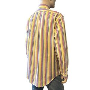 Features: Full button front with classic full placket, buttoned cuffed long sleeves, button down collar, rounded tail, box pleat at back, colourful stripe pattern, classic Ralph Lauren Polo embroidered on front chest, non stretch fabric