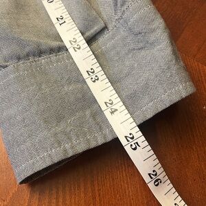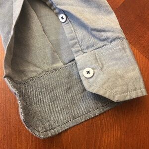Ralph Lauren Oxford Gray Button Down Shirt. This shirt has nice details. Button-tab sleeves with faux leather tabs, red, white and blue buttons and contrasting cuffs.