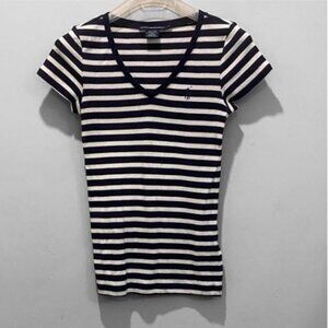 Ralph Lauren Sport Navy White Striped V-Neck T-Shirt Women’s Size Small Stretchy