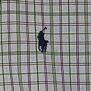 Ralph Lauren Yarmouth Shirt. Men's tag size 16.5 - 34/35. 100% cotton. Blue, green, black tattersall check. Embroidered chest polo pony. Button down collar. Single button adjustable cuff with button close wrist tab. Lightweight.
