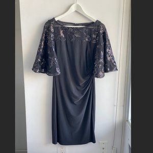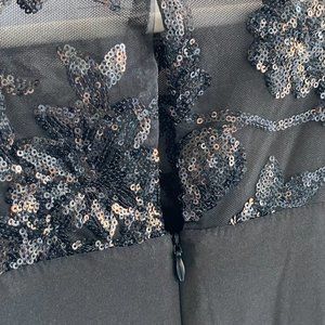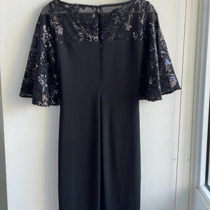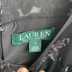 Super chic black cocktail dress by Ralph Lauren. Sequin details on neckline and bat-wing style sleeves. Size 6.